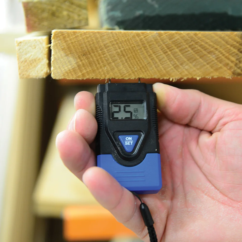 Hygromètre avec écran LCD rétro-éclairé. Détermine le taux d'humidité dans le bois, mais aussi dans les matériaux tels que le plâtre, béton et mortier, etc. Idéal pour vérifier l'humidité du bois de cheminée, des murs ou autres structures de construction. Affiche également la température ambiante en Celsius ou en Fahrenheit. Avec une dragonne. 4 piles bouton LR44 requises.